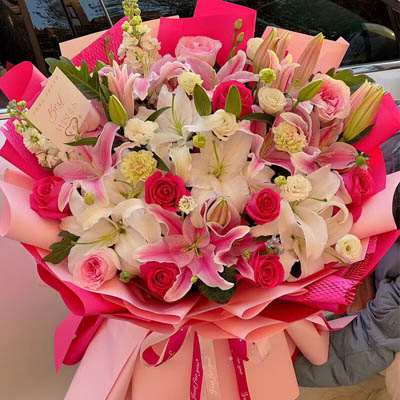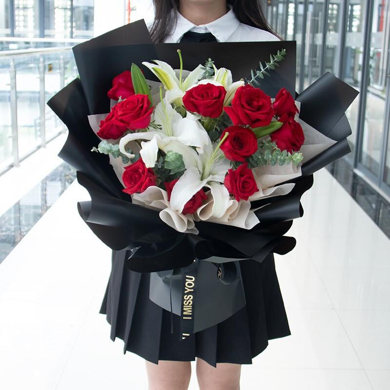 【不负韶华】红玫瑰、粉玫瑰混搭共11朵,白色、粉色多头香水百合共8支,搭配洋桔梗、尤加利叶装饰。