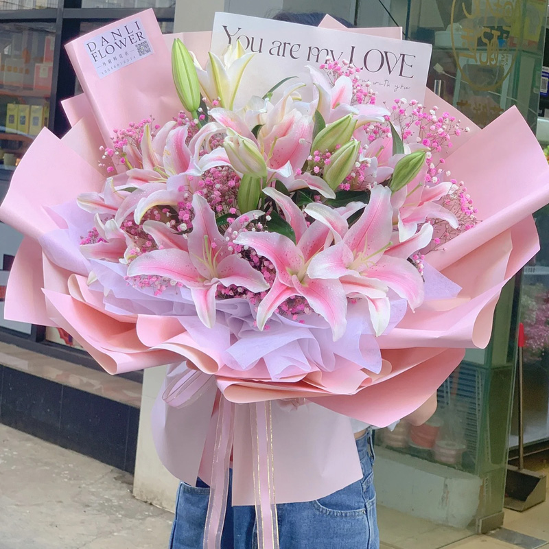 【琴瑟和鸣】7枝多头粉色香水百合,粉色满天星装饰。