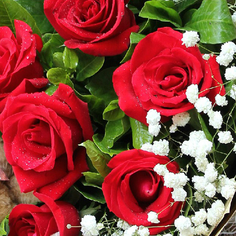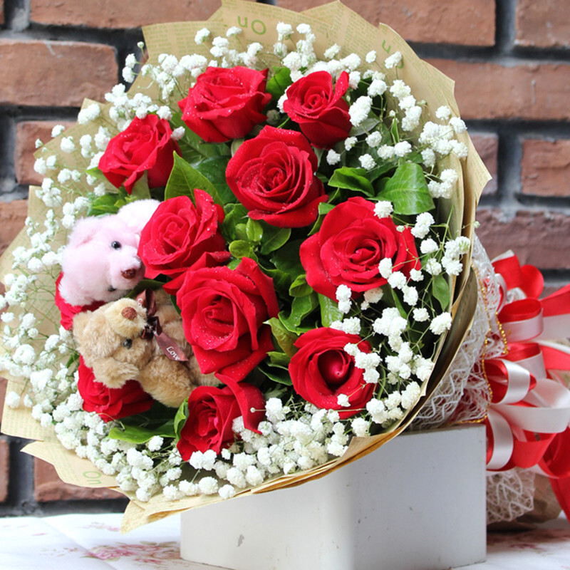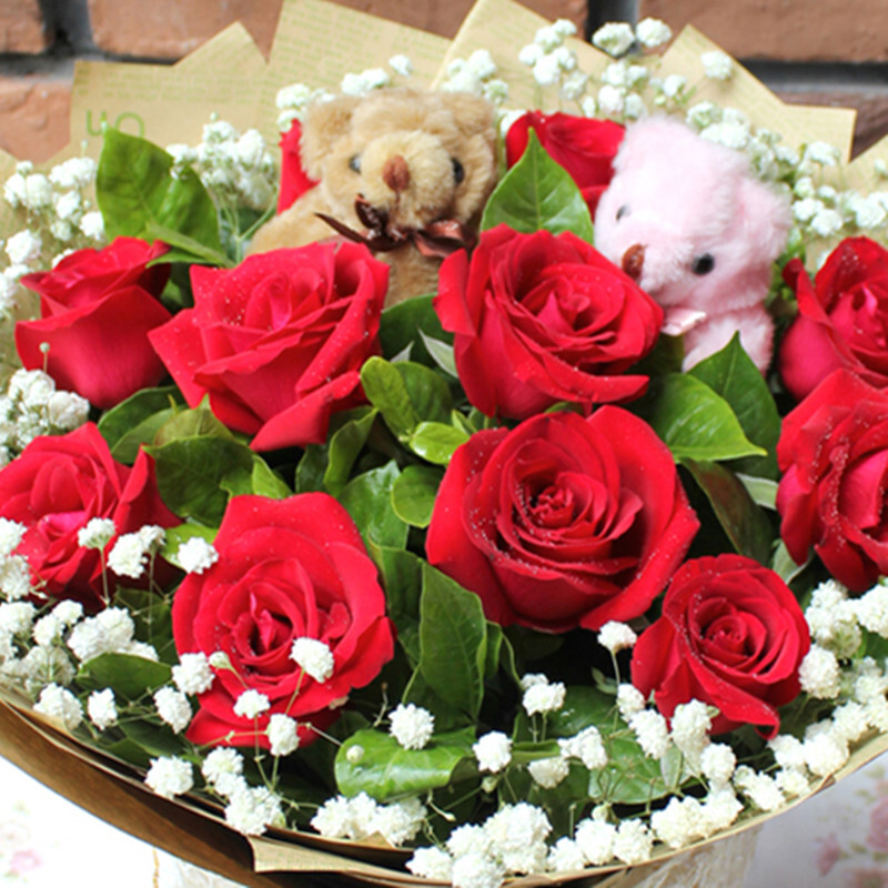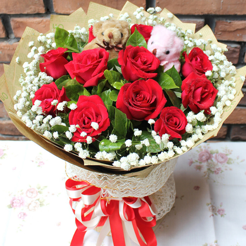 花 材:11支精品红玫瑰+2只可爱小熊,搭配适量白色满天星、栀子叶。