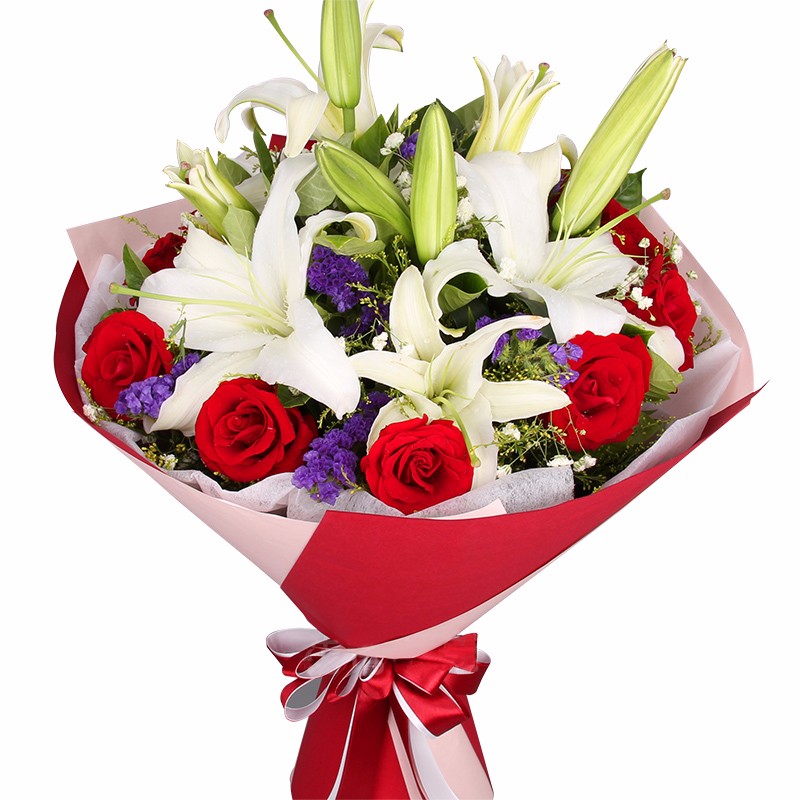 花材: 精选11朵红玫瑰,1支多头白色香水百合,搭配尤加利叶、满天星丰满装饰。
