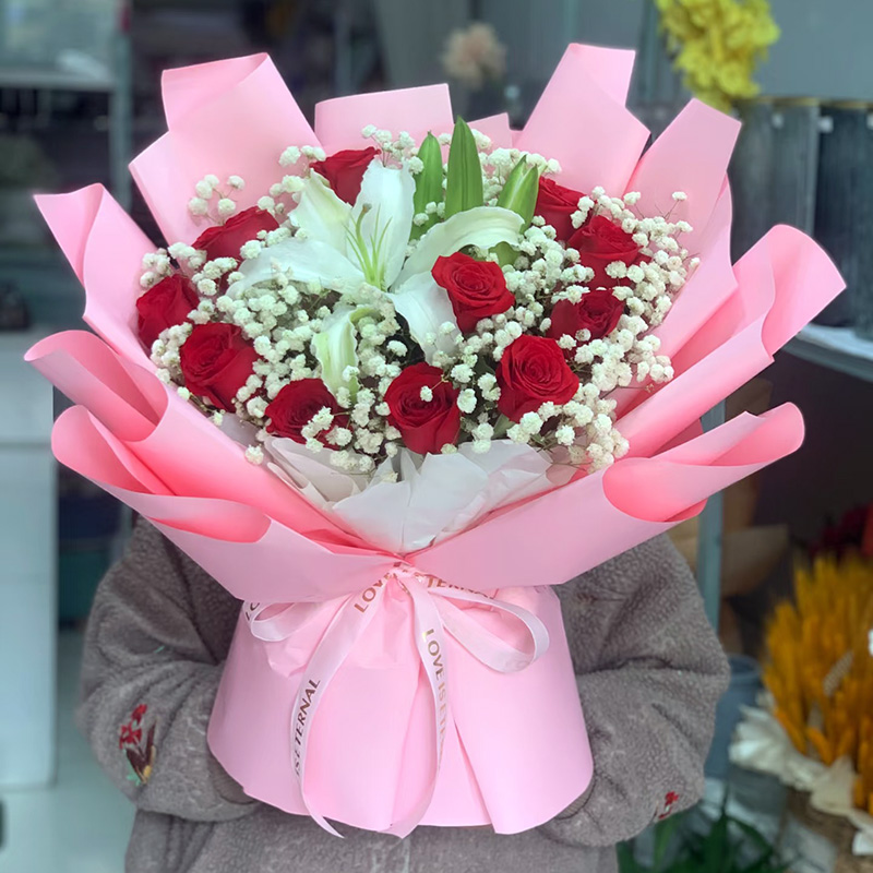 花 材:精选11朵红玫瑰,1支多头白色香水百合,搭配尤加利叶、满天星丰满装饰。