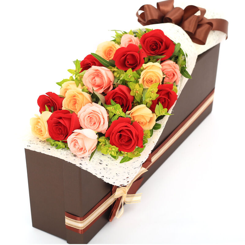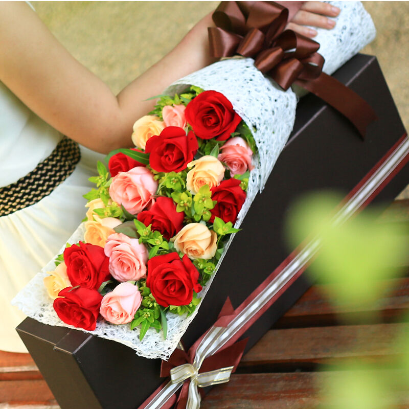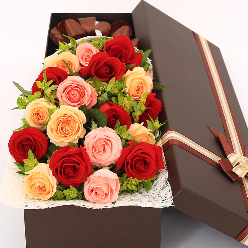 花 材:精选19朵玫瑰(8朵红玫瑰,6朵香槟玫瑰,5朵粉玫瑰),叶上黄金点缀。