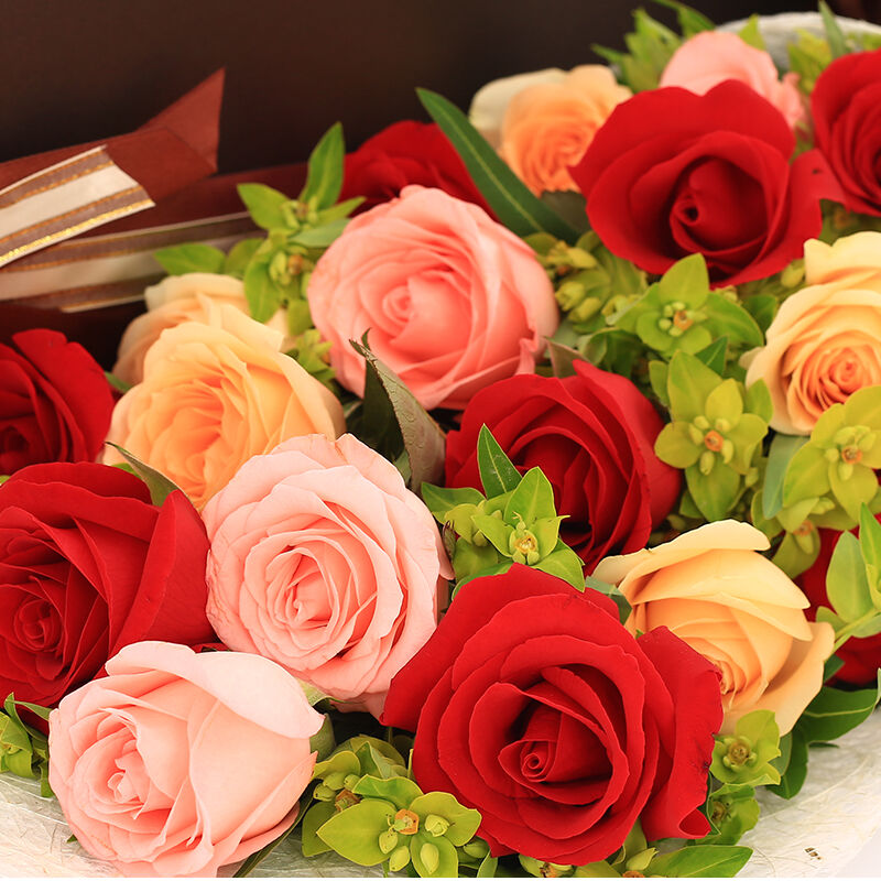 花材: 精选19朵玫瑰(8朵红玫瑰,6朵香槟玫瑰,5朵粉玫瑰),叶上黄金点缀。