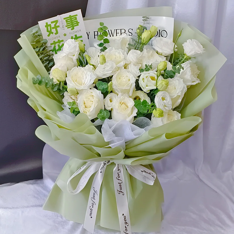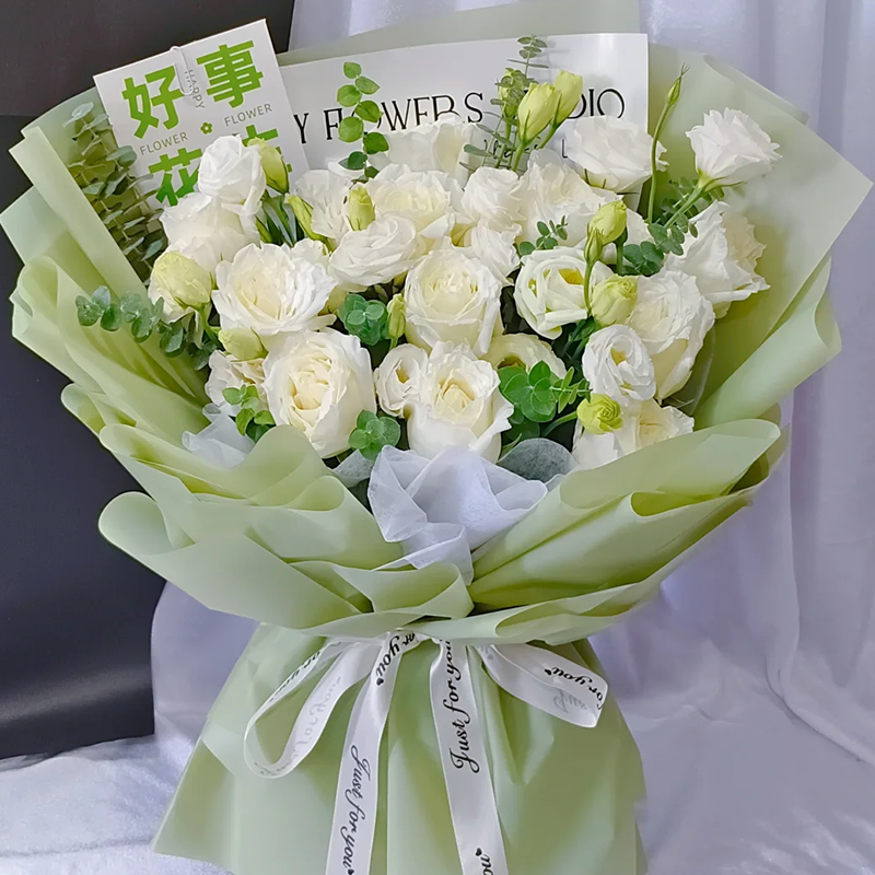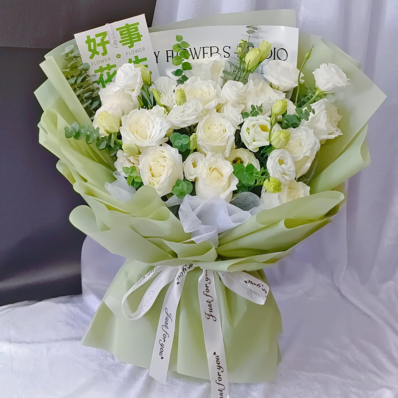 花材: 精选11朵白玫瑰,5枝多头洋桔梗,搭配尤加利叶装饰。