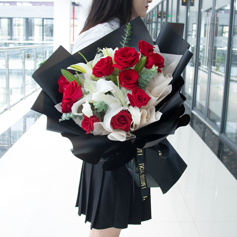 花材: 精选11朵红玫瑰,2支白色多头香水百合,搭配尤加利叶装饰。