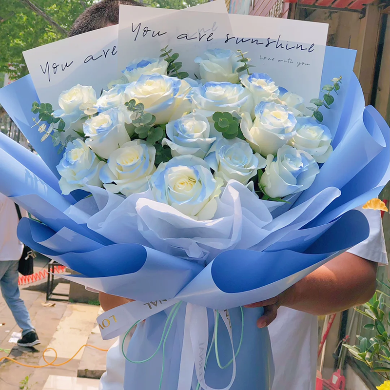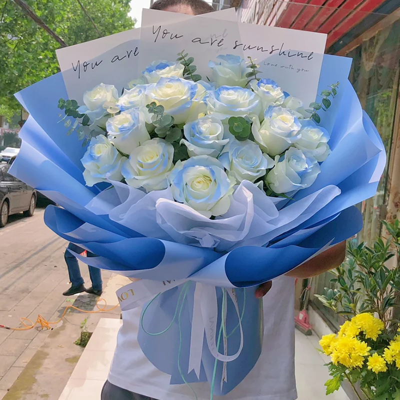 花材: 19朵碎冰蓝玫瑰,尤加利叶间插装饰。