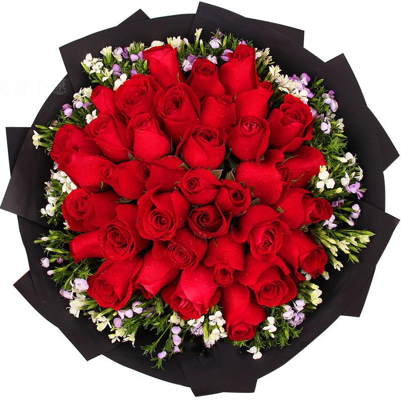 花 材:33支精品红玫瑰,搭配相思梅(或白色满天星)丰满环绕。