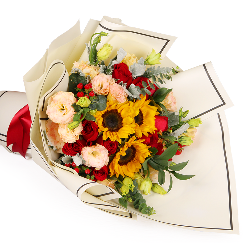 花材: 11支精品红玫瑰+3支向日葵,搭配5支香槟色洋桔梗、红豆、尤加利、银叶菊
