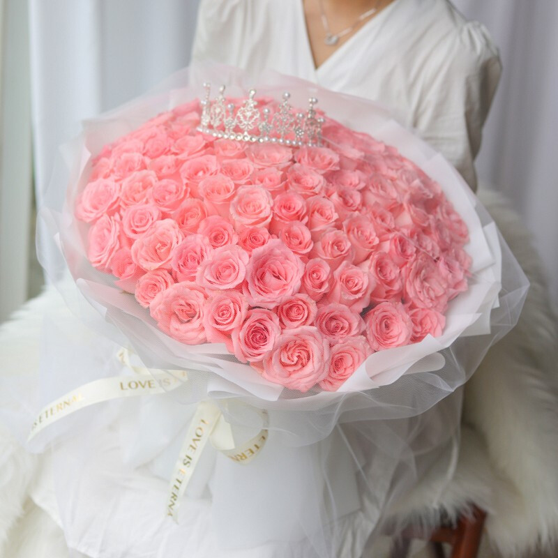花 材:99朵粉玫瑰,搭配皇冠装饰。