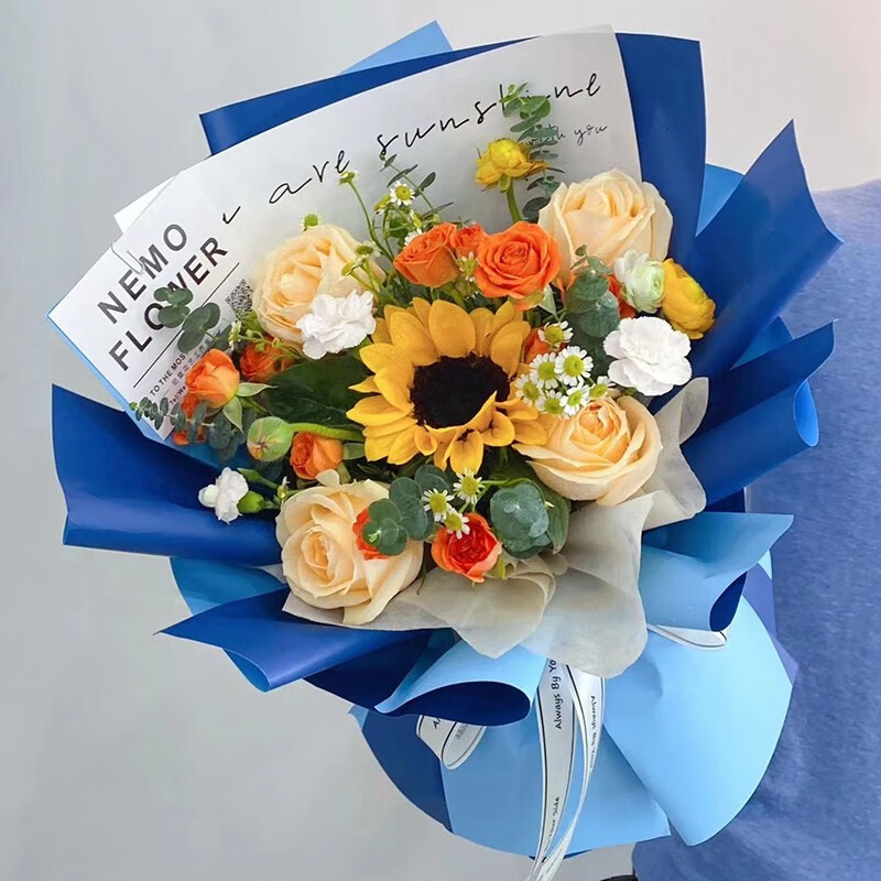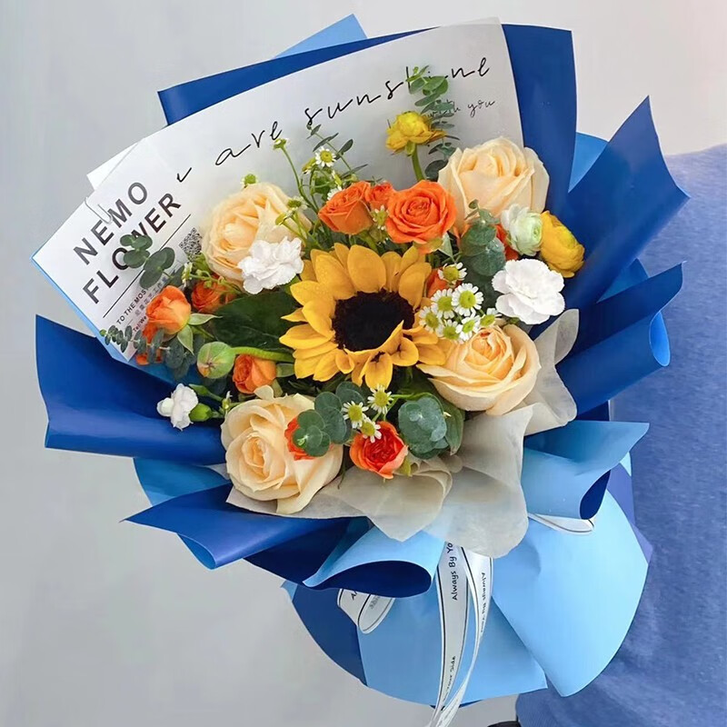 花材: 1朵向日葵,4支香槟玫瑰,2支洋桔梗,4支橙色多头泡泡,搭配尤加利叶、小雏菊等装饰。
