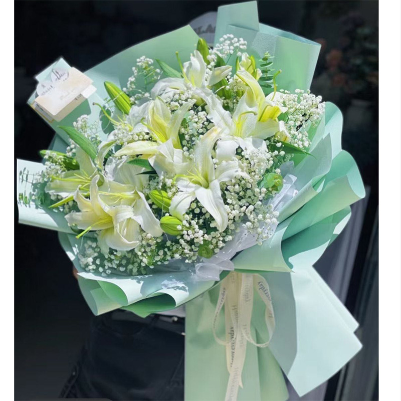 花 材:12朵白色香水百合,满天星、尤加利叶点缀。