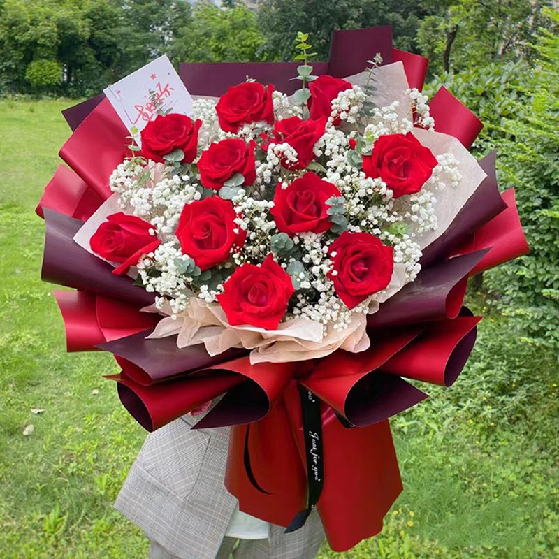 花材: 11朵卡罗拉红玫瑰,搭配白色满天星、尤加利叶丰满间插。