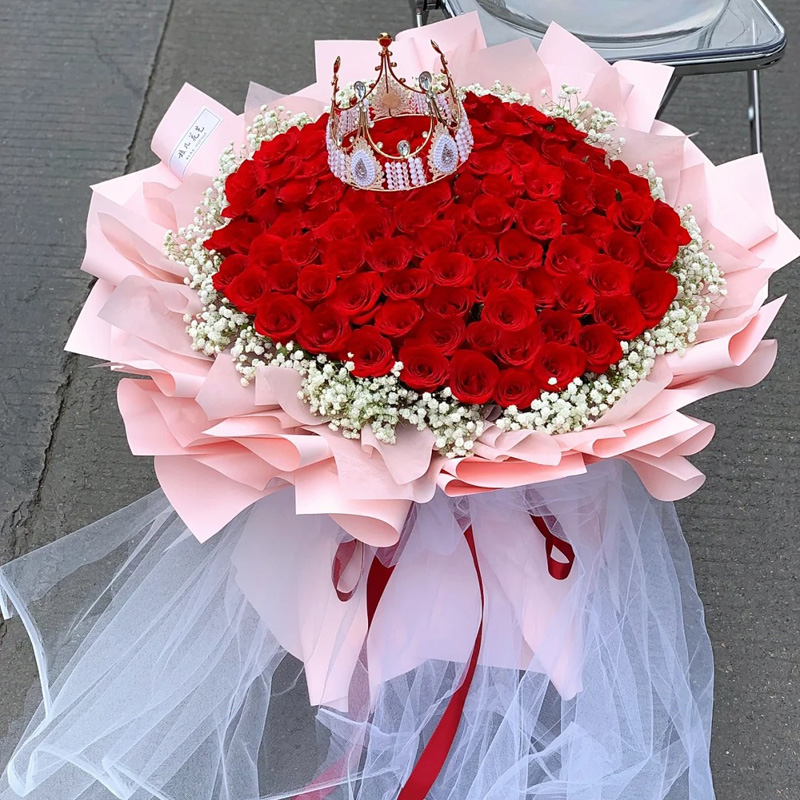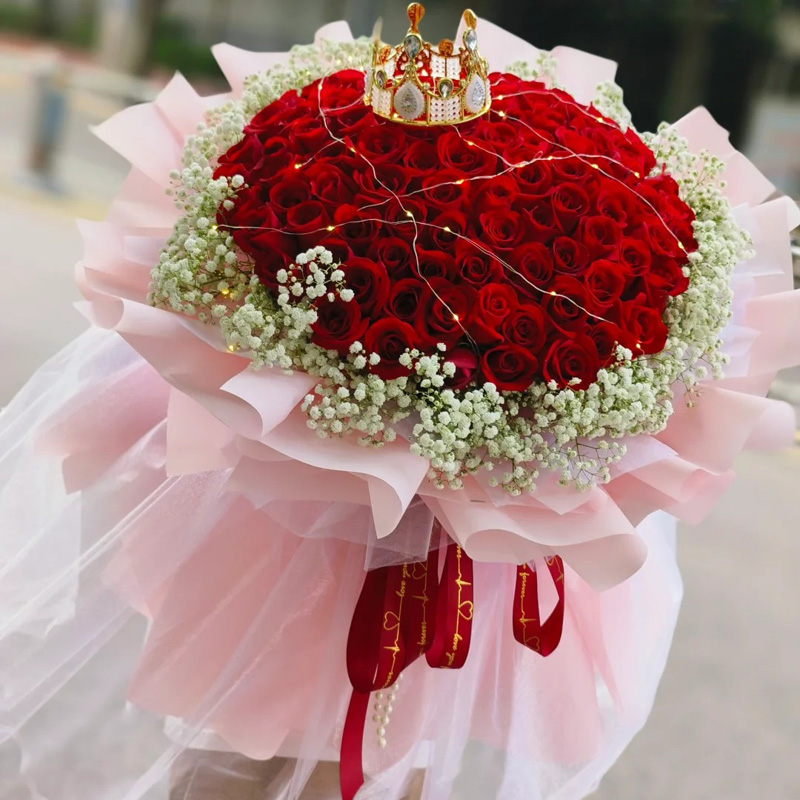 花 材:精选99朵红色玫瑰花,1条灯带,1个皇冠,满天星外围环绕。