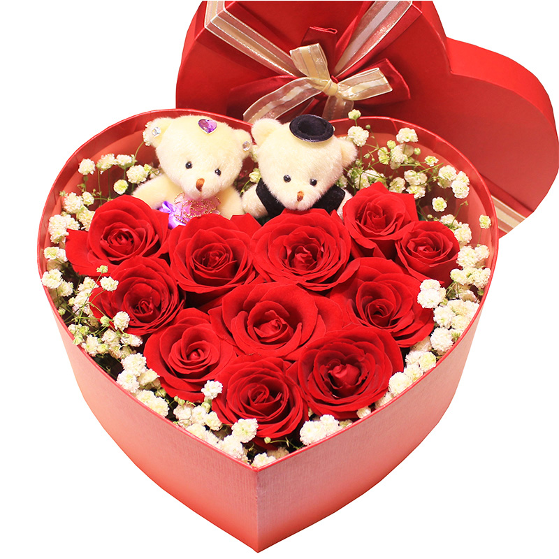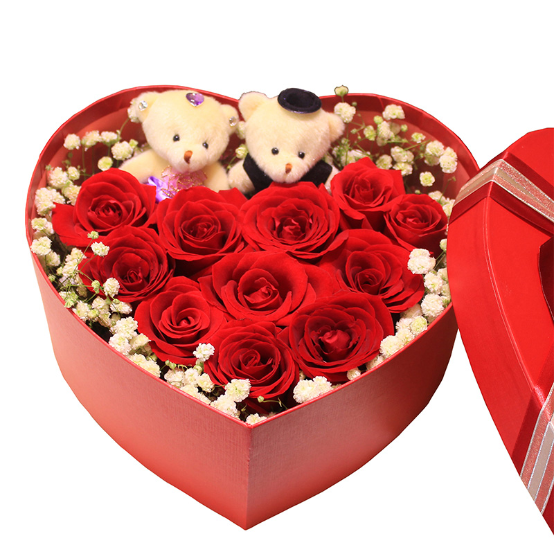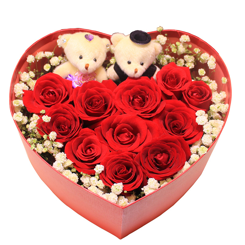 花 材:11支红玫瑰,搭配两只可爱小熊、适量满天星。