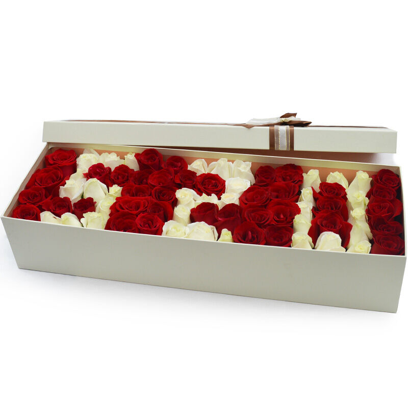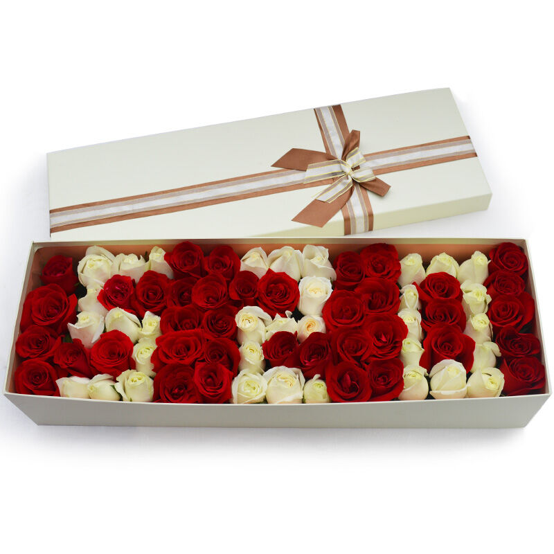 花 材:72支混色玫瑰,组成“520形状”,红玫瑰、香槟玫瑰混搭。