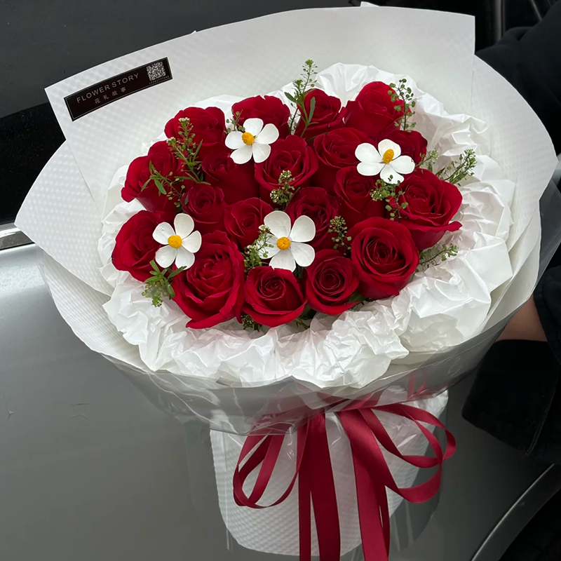 花 材:精选19枝红玫瑰,4支紫罗兰永生花,绿铃草或黄莺草装饰。