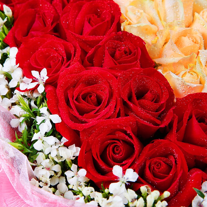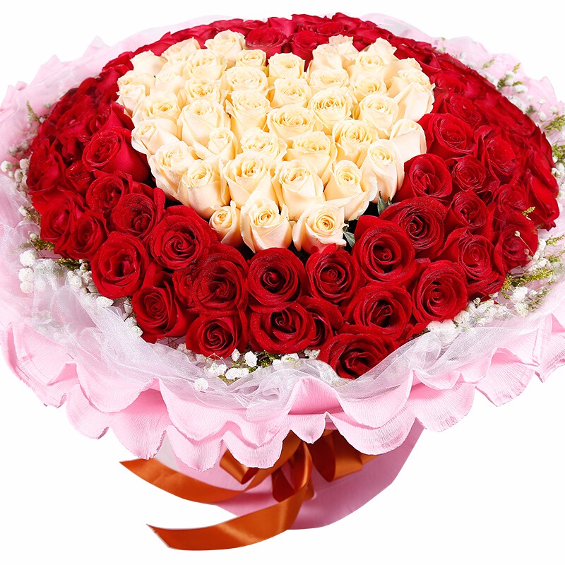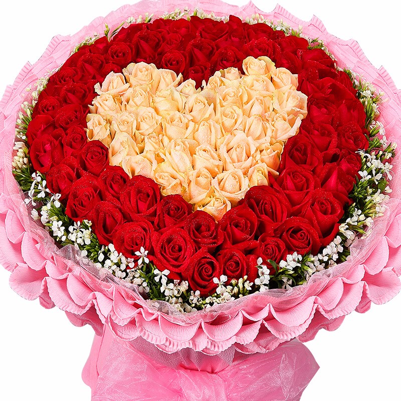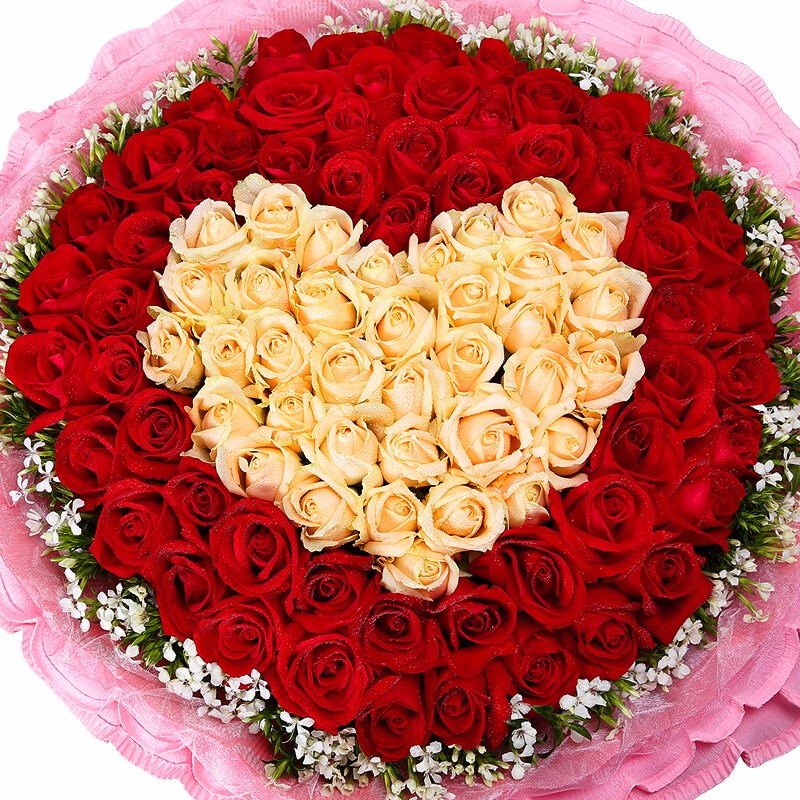 花材: 精选红玫瑰、香槟玫瑰共99朵,香槟玫瑰围成心形,外围相思梅点缀。
