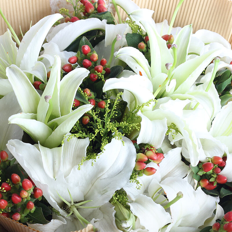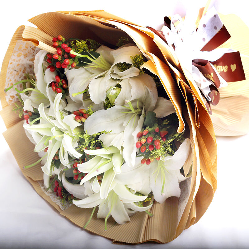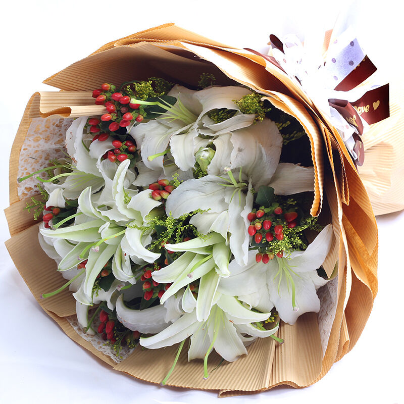 花 材:精选11朵香水百合,搭配相思豆、黄莺点缀。