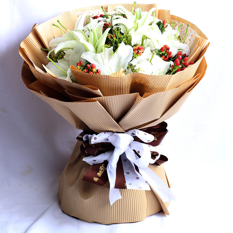 包 装:里层米白镂空梦幻纸,外层黄色包装纸,白色+褐色缎带系花结。