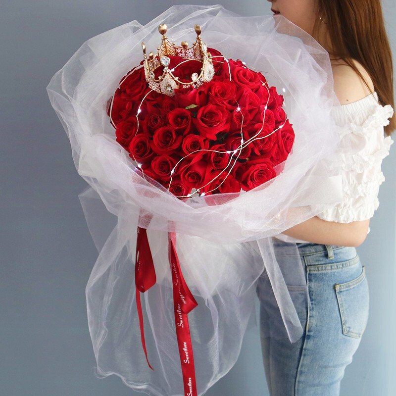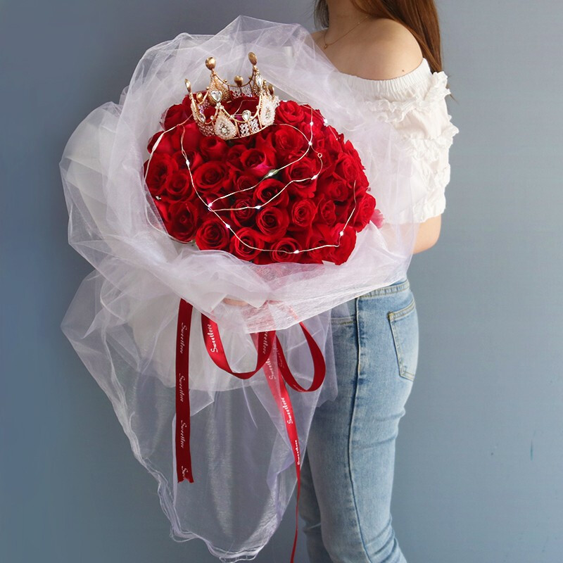 花 材:33支精品红玫瑰,可发光灯带+精美皇冠装饰。