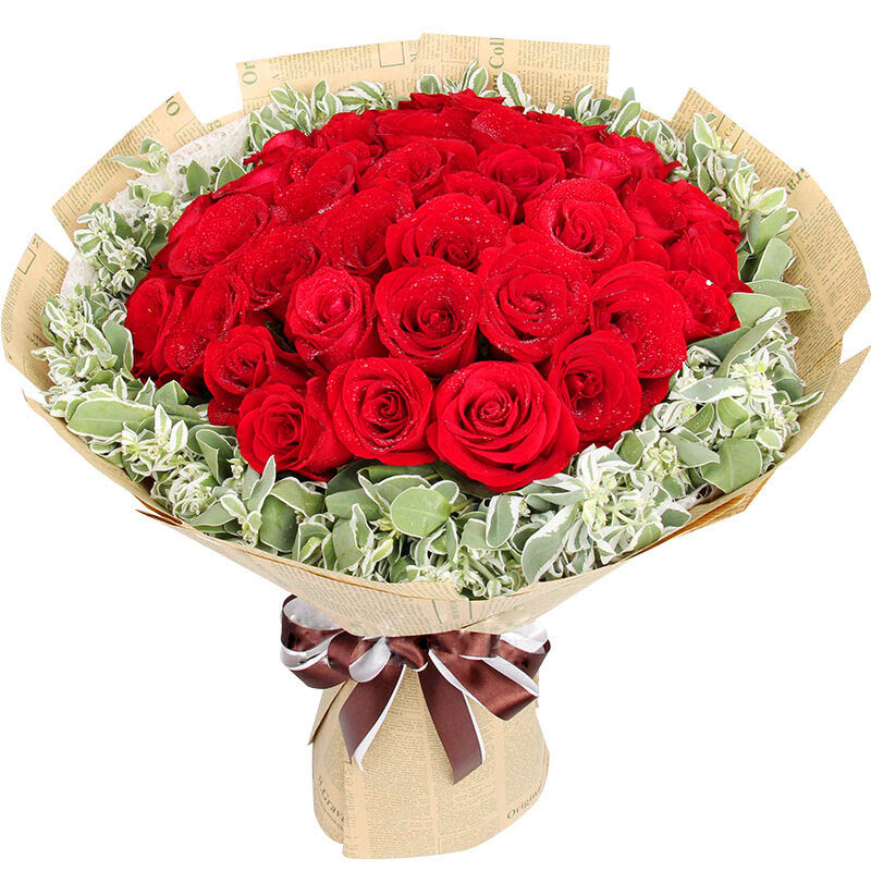 包 装:内层白色落水纸,外层英文报纸如图包装,酒红色花结束扎。