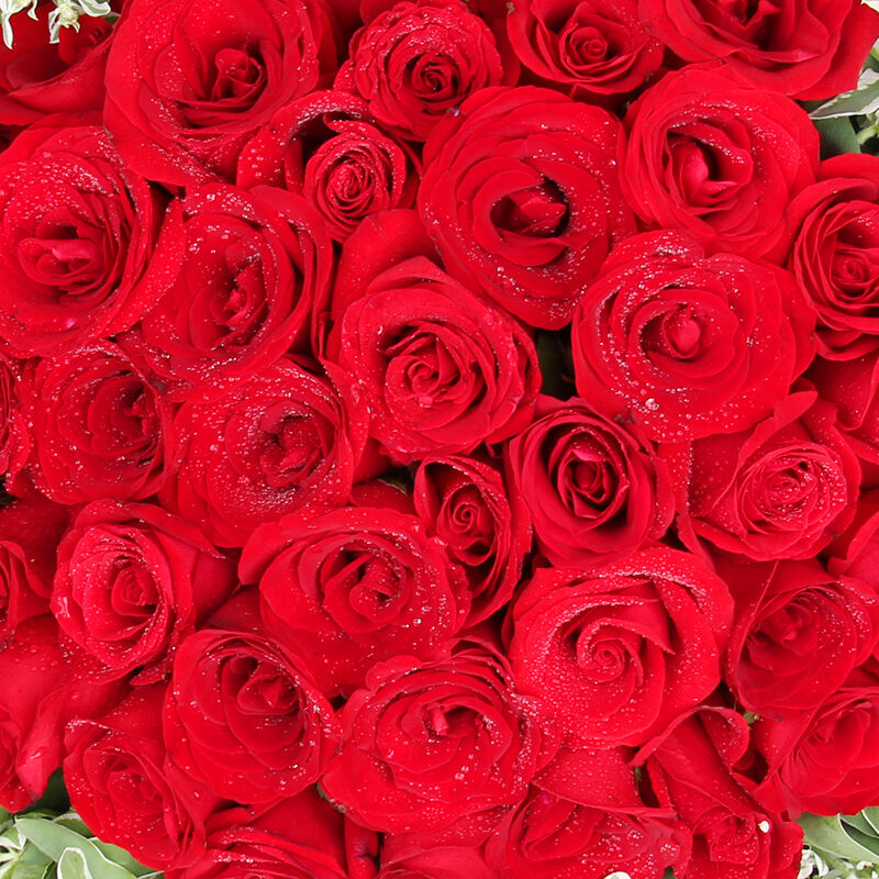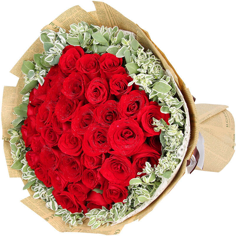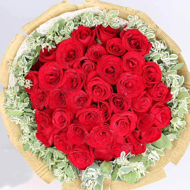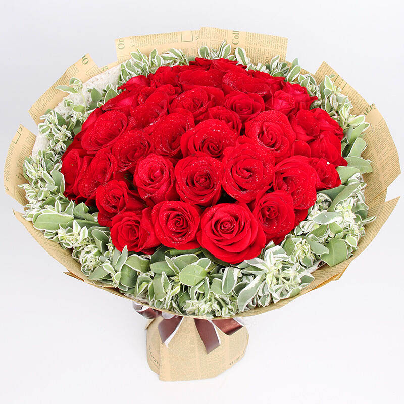 花 材:33朵精品红玫瑰,叶上花丰满搭配。