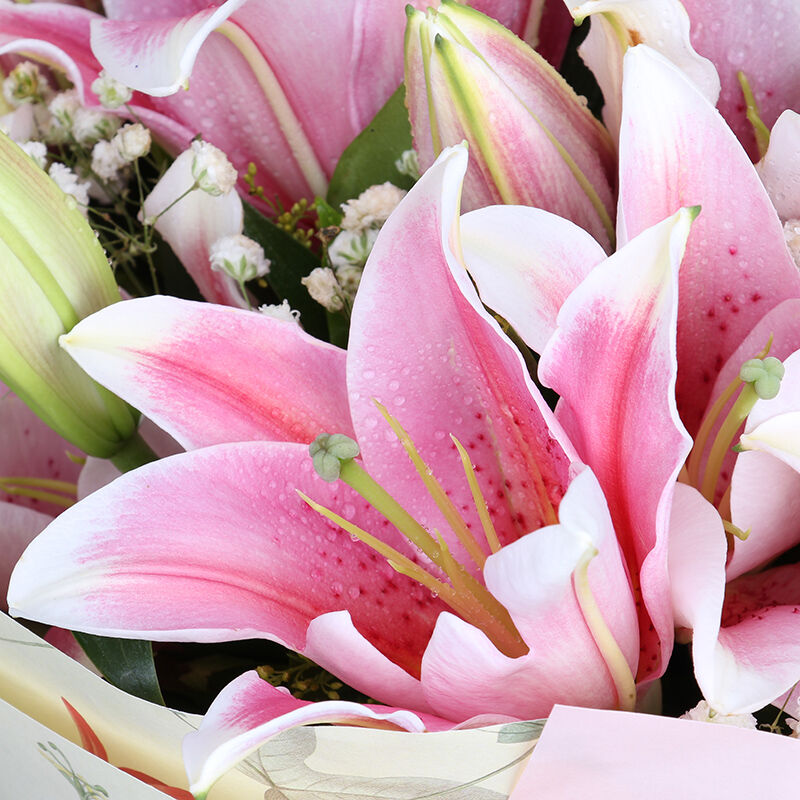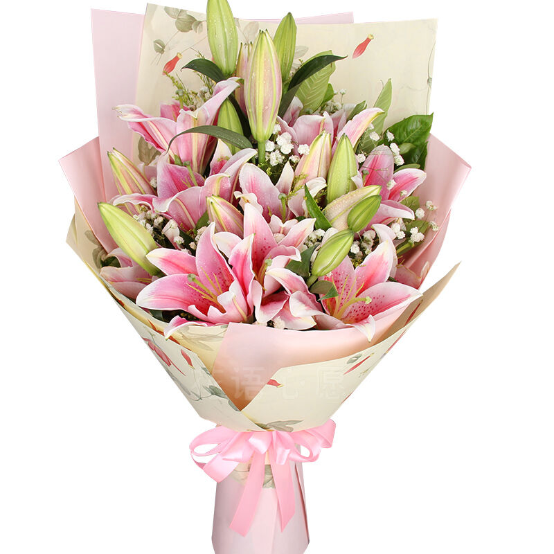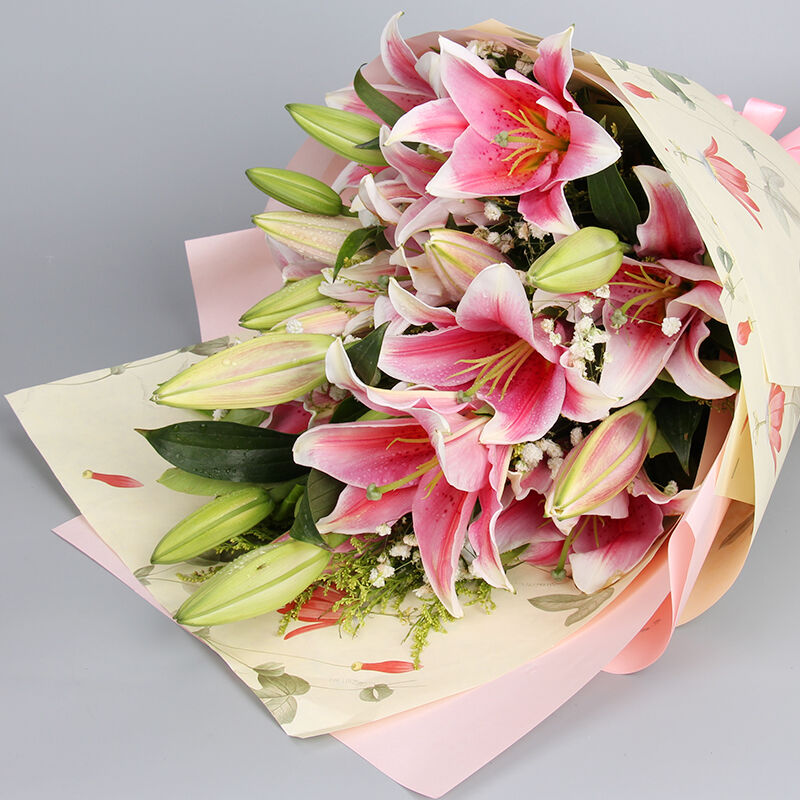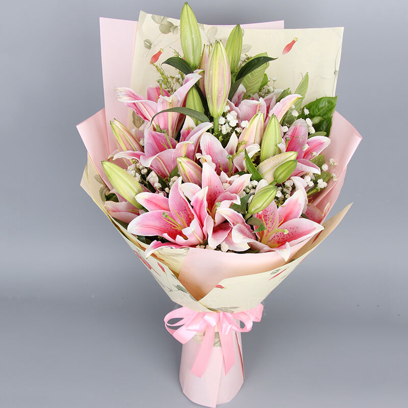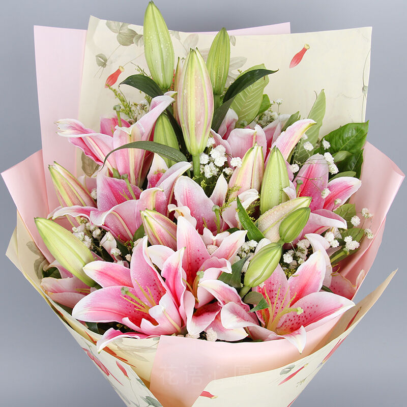 花 材:精心挑选21朵香水百合,搭配满天星、黄莺、栀子叶。