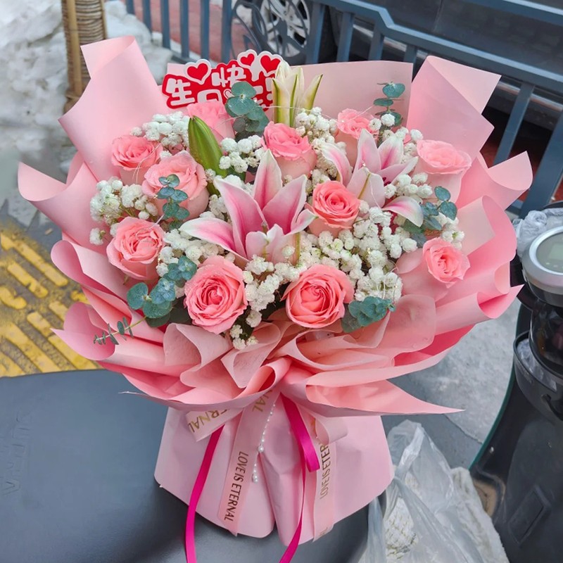 花材: 11枝戴安娜粉玫瑰,2枝多头粉百合,白色满天星,尤加利叶间插点缀。