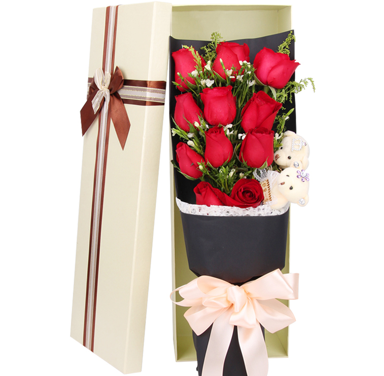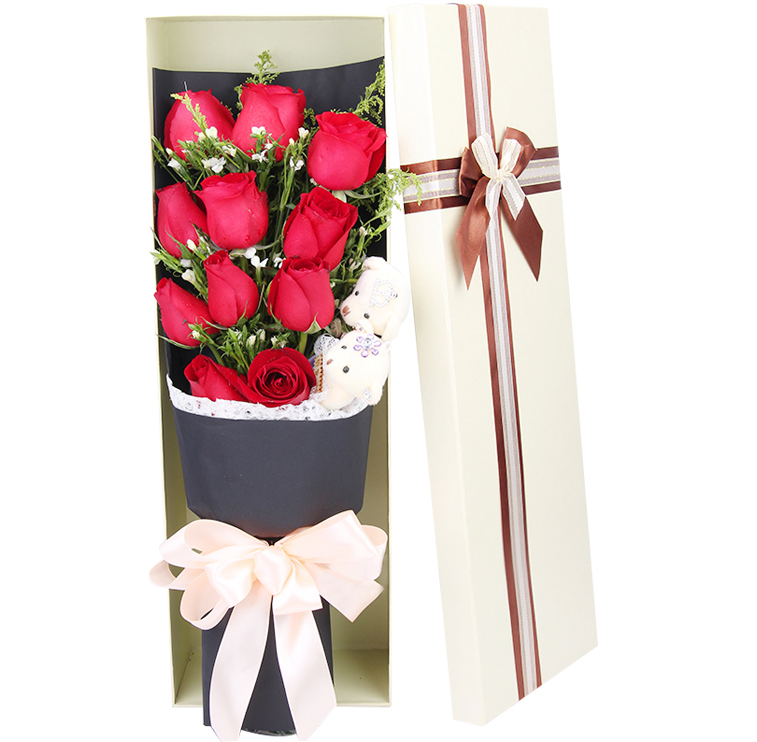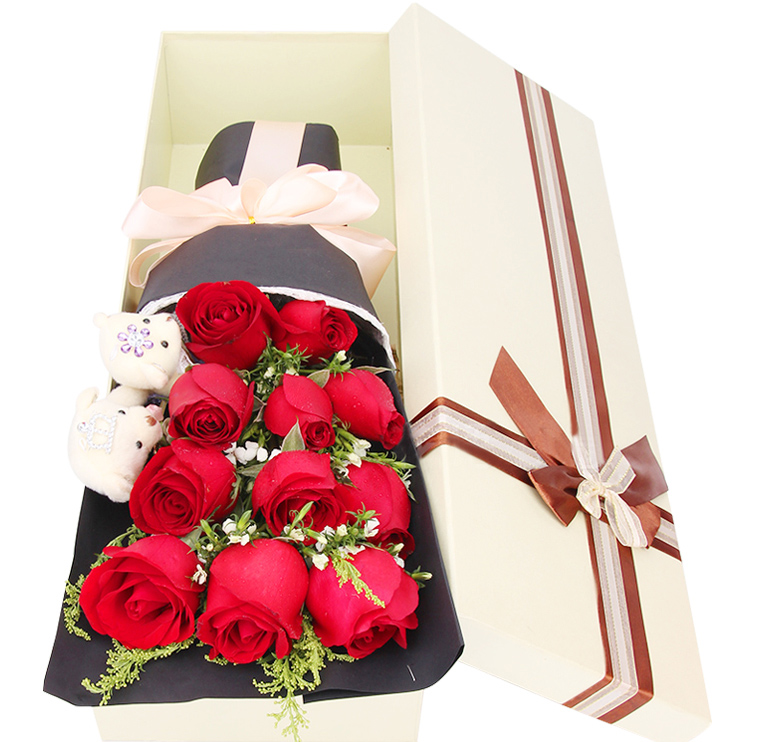 花材: 11朵精品红玫瑰,一对小熊,搭配相思梅、黄莺。