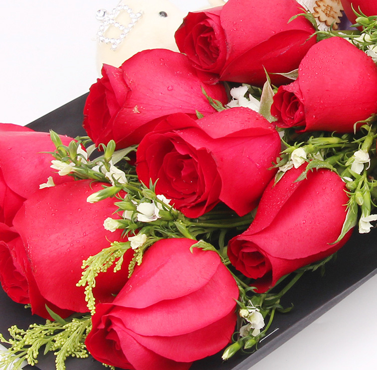 花 材:11朵精品红玫瑰,一对小熊,搭配相思梅、黄莺。