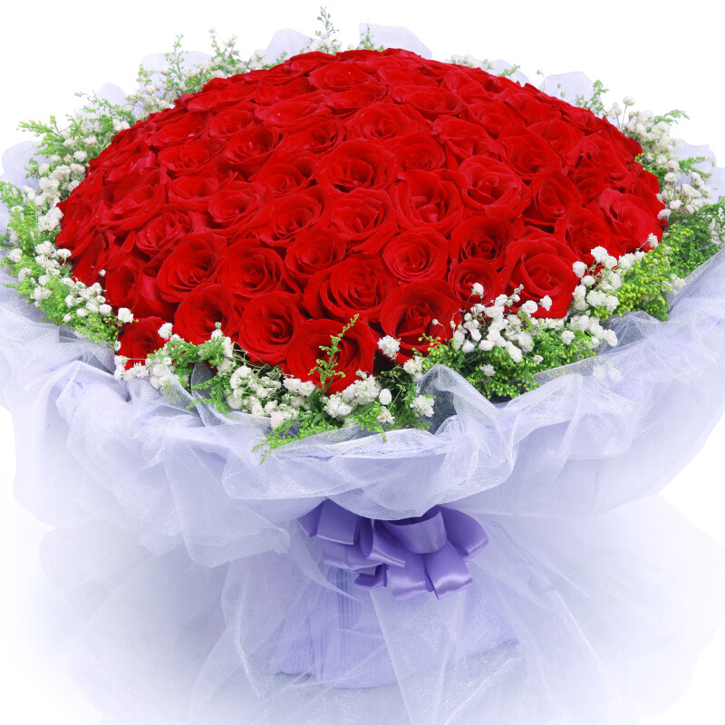 花材: 精选顶级99朵红玫瑰,黄莺、满天星围绕。