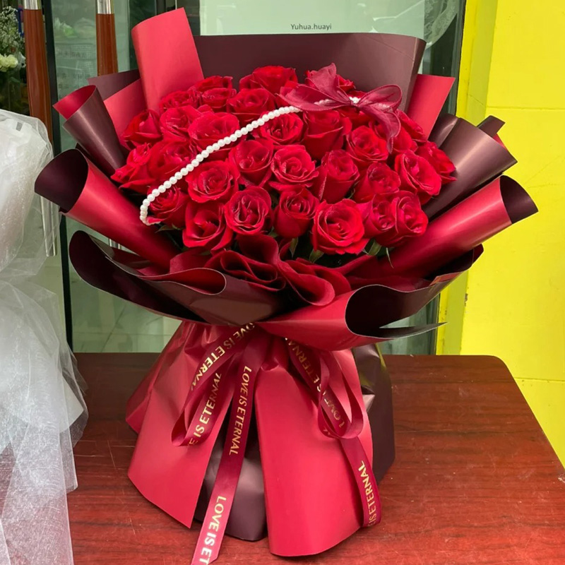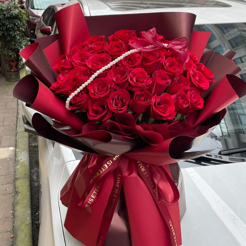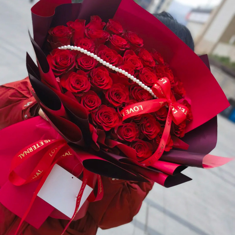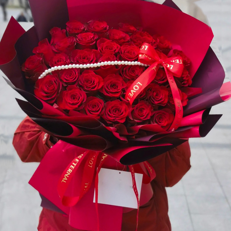 花 材:33朵红玫瑰,1条珠链装饰花面,珠链上系红色蝴蝶结。