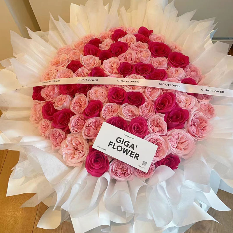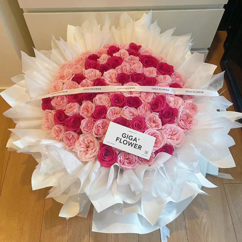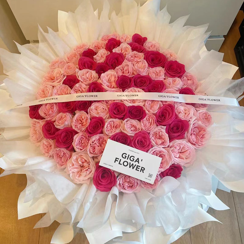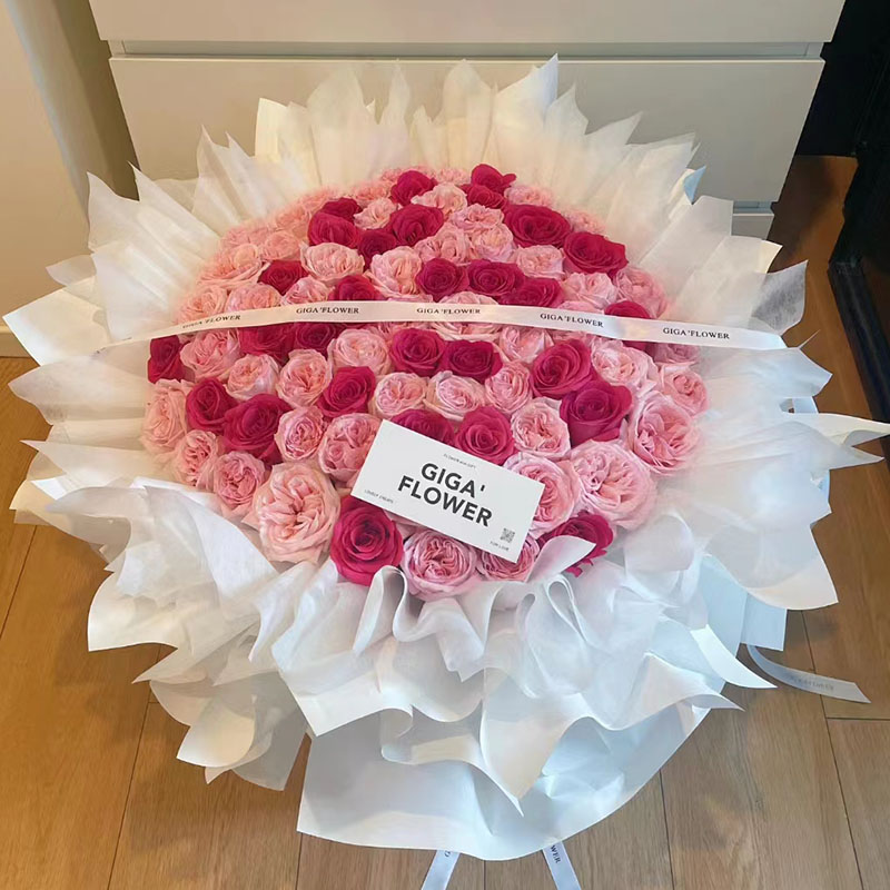 花 材:精选99朵红色、粉色玫瑰,其中66朵粉荔枝玫瑰,33朵弗洛伊德红玫瑰,白色缎带装饰花面。
