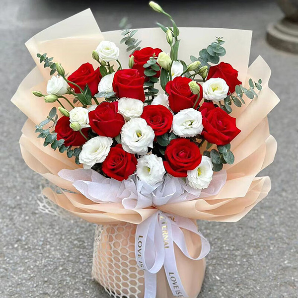 花 材:11枝红玫瑰,5枝浅色多头洋桔梗,搭配尤加利叶装饰。