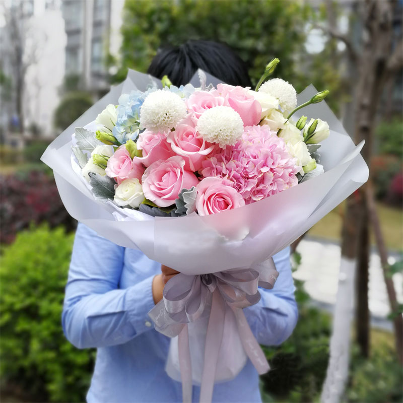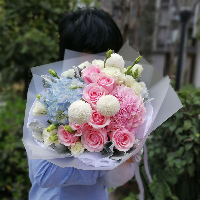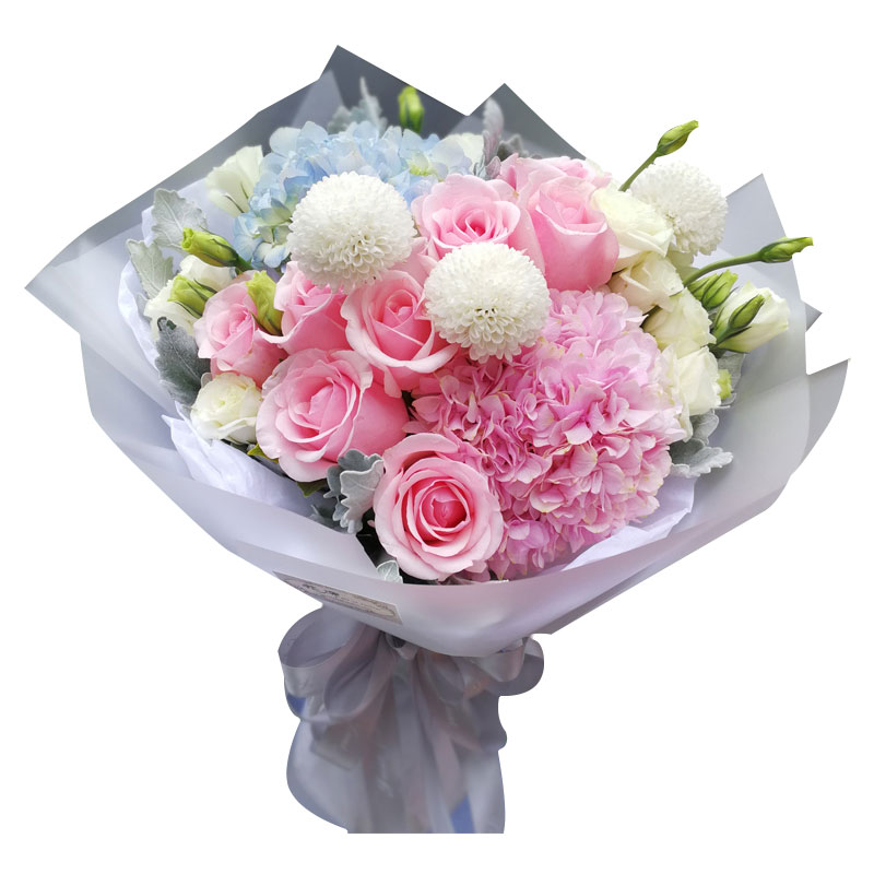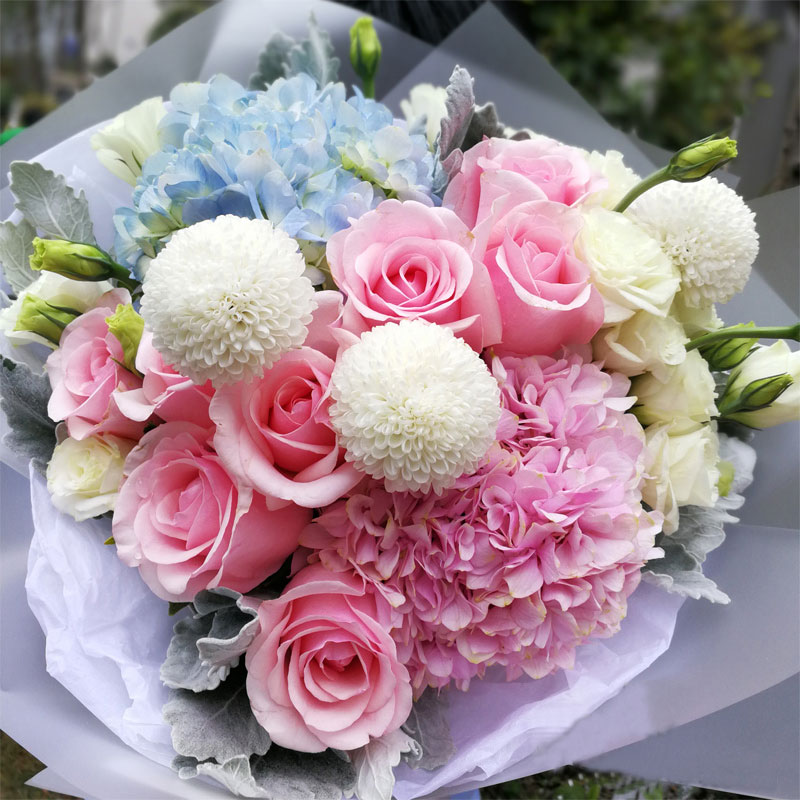 花材: 两只绣球花,9支顶级粉色戴安娜,搭配大量桔梗、乒乓菊、银叶菊。
