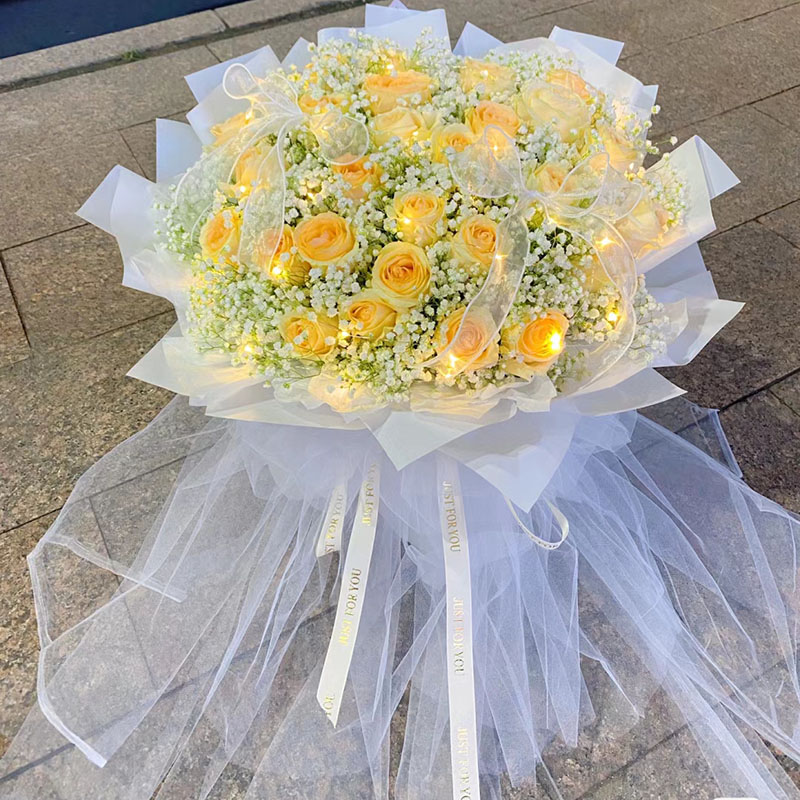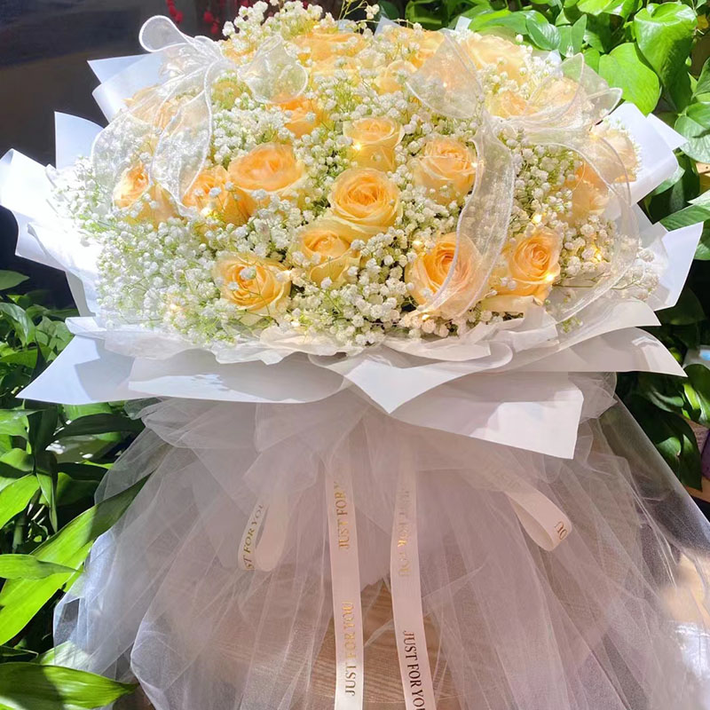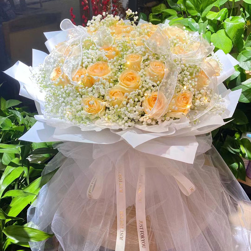 花材: 33朵香槟玫瑰,1条灯带,2支蕾丝蝴蝶结装饰花面,搭配满天星装饰。