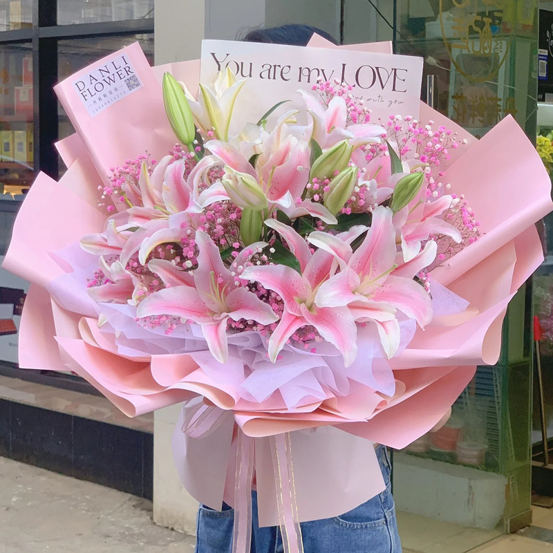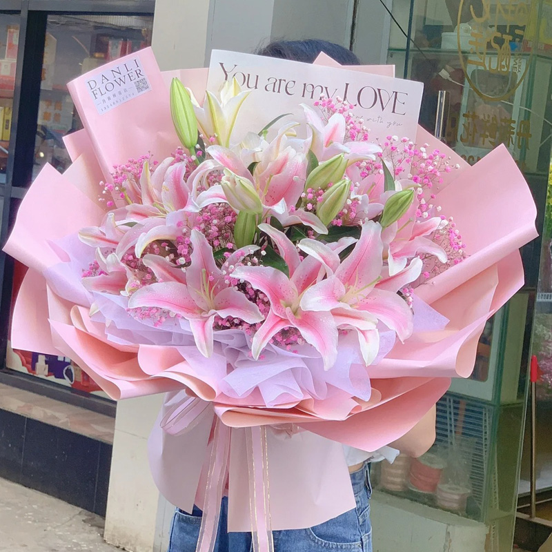 花 材:7枝多头粉色香水百合,粉色满天星装饰。