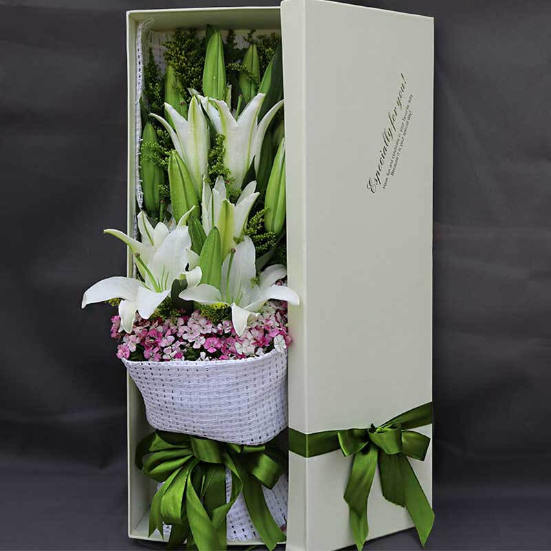 包装: 白色格子网包装,搭配绿色丝带,长方形礼盒装。