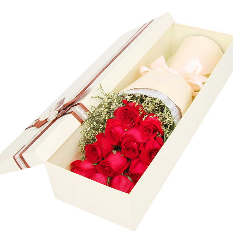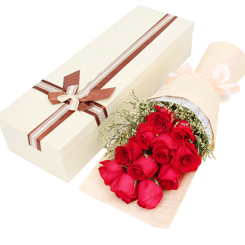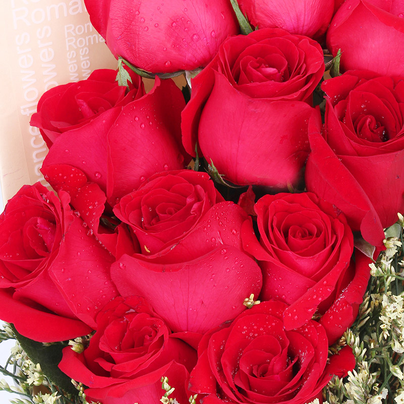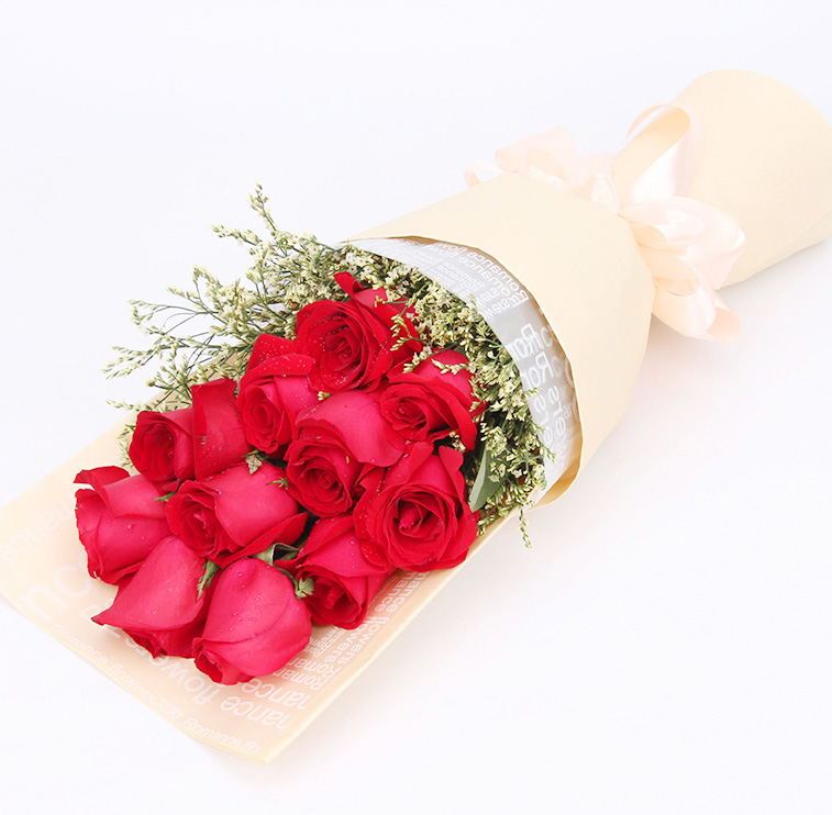 花 材:精选11朵红玫瑰,搭配水晶草点缀。