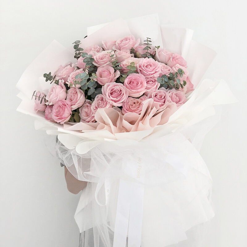 花 材:33朵精品粉玫瑰,搭配尤加利叶点缀。