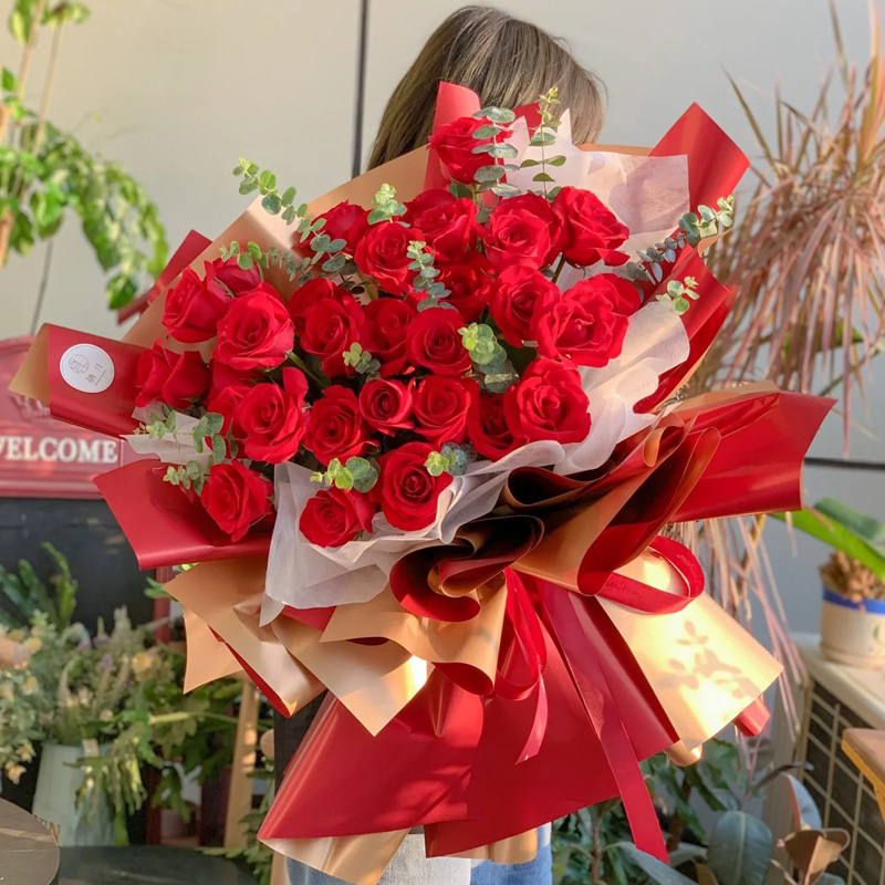 花材: 33朵红玫瑰松散包装,尤加利叶间插装饰。