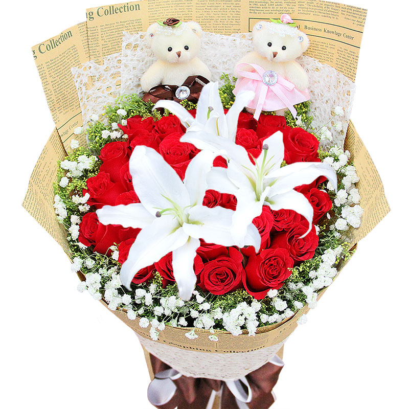 花材: 33支红玫瑰、1支多头白百合,2只小熊,搭配适量满天星、黄莺。