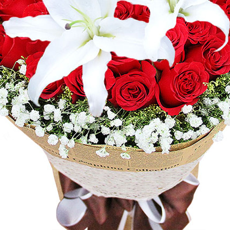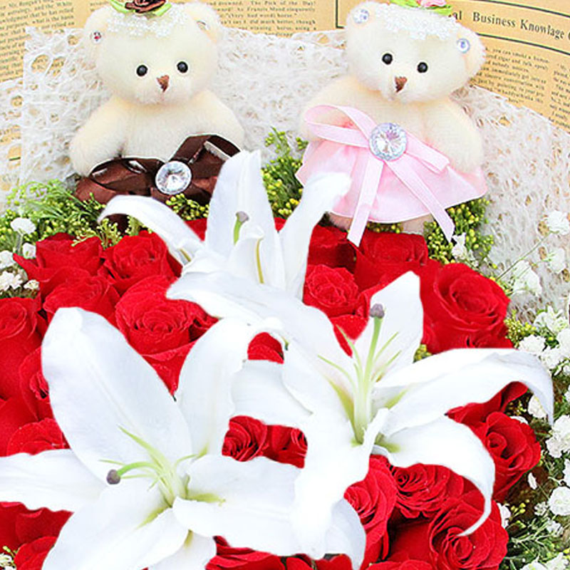 花 材:33支红玫瑰、1支多头白百合,2只小熊,搭配适量满天星、黄莺。