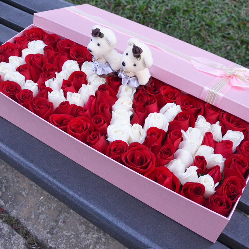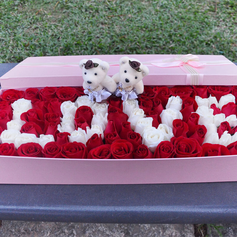 花材: 99枝(红玫瑰+白玫瑰)拼成LOVE字样,一对情侣小熊。
