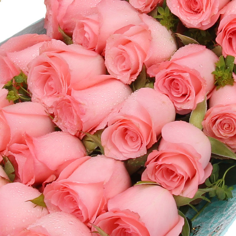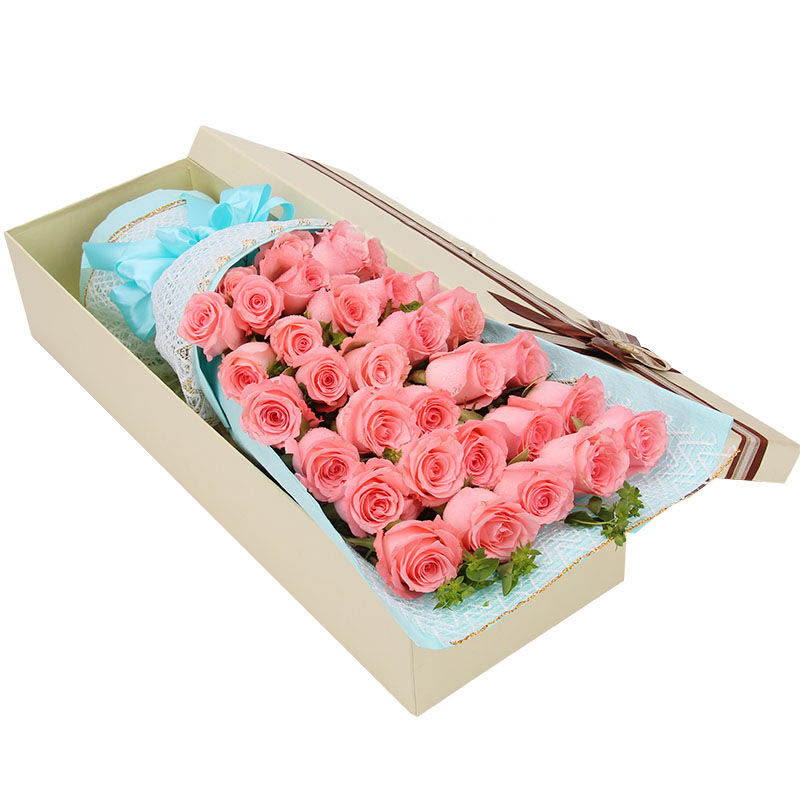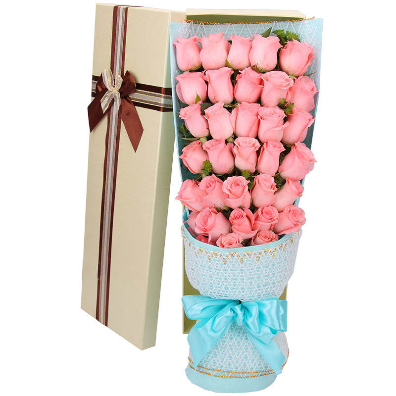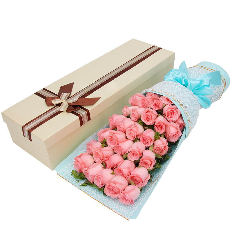 包 装:内层白色W网,外层天蓝色包装纸包装,W网托底,绿色缎带花结束扎,长方形白色礼盒。