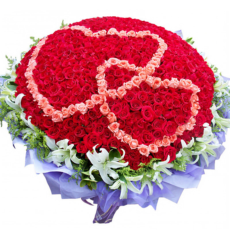 花 材:999支顶级玫瑰(933支云南顶级红玫瑰,66支粉玫瑰),19支多头香水百合,黄莺间插搭配。