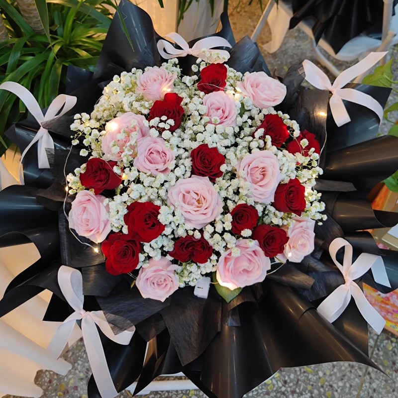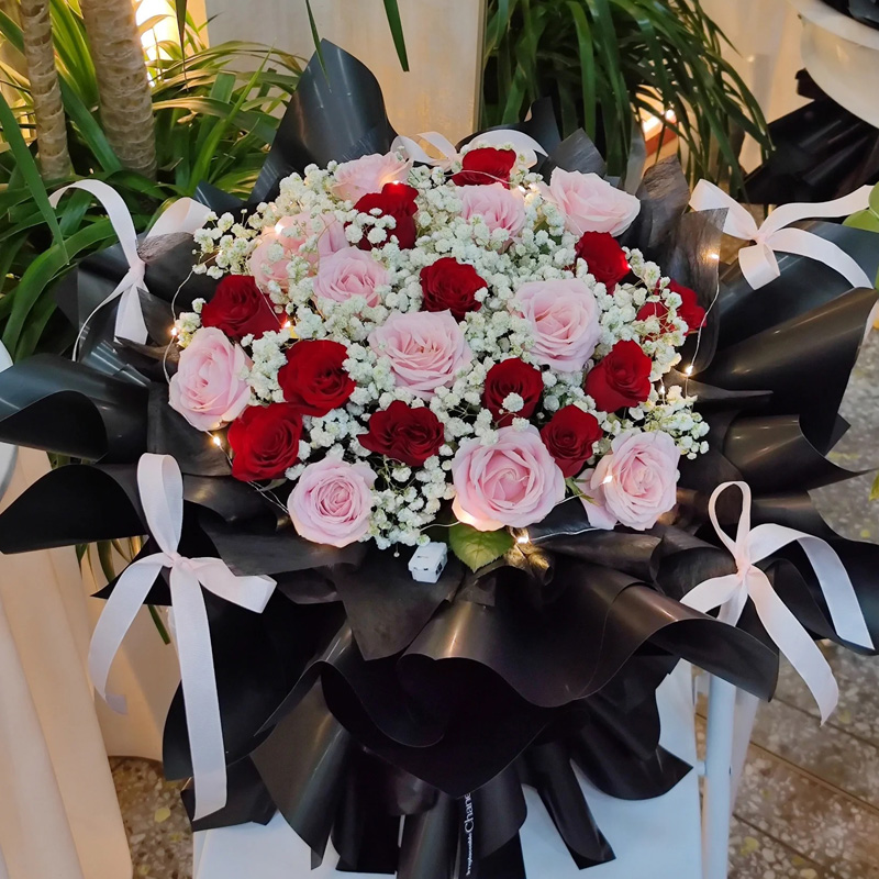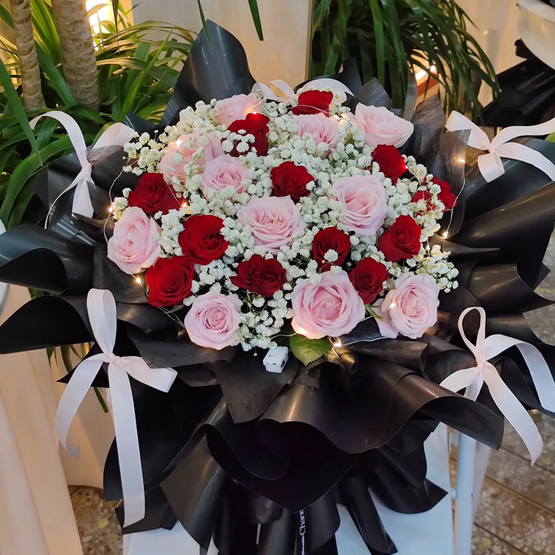 花材: 红玫瑰、粉玫瑰共24朵,1条灯带,满天星、栀子叶丰满间插。