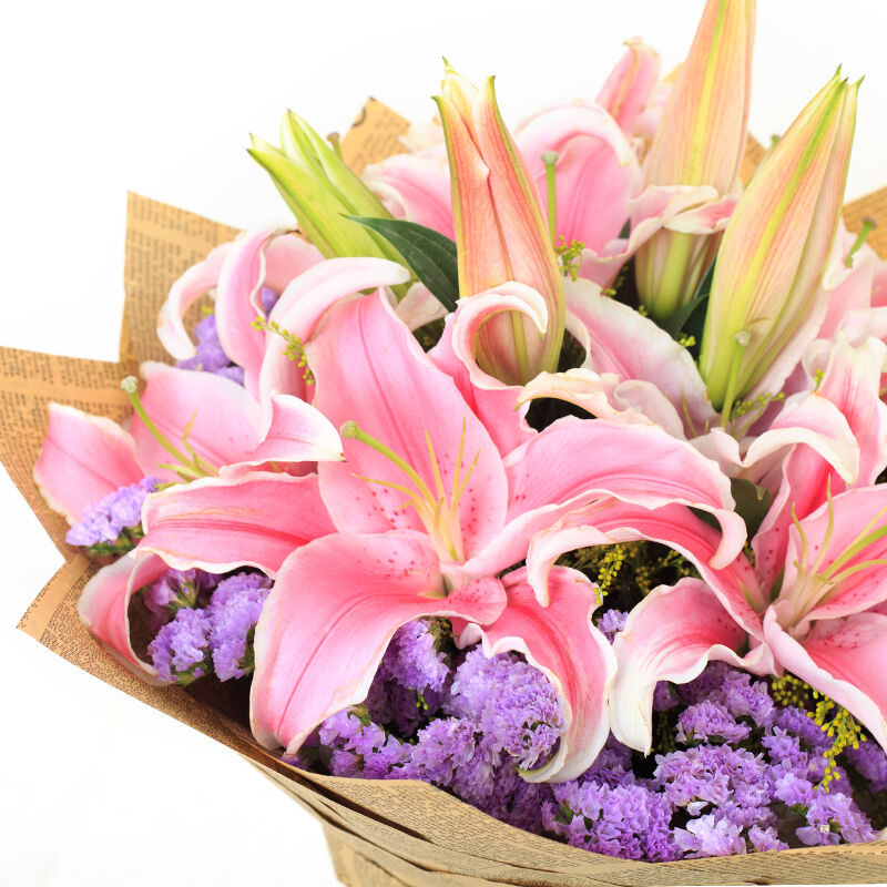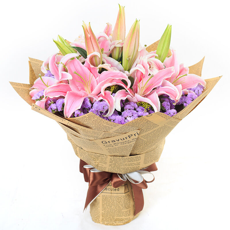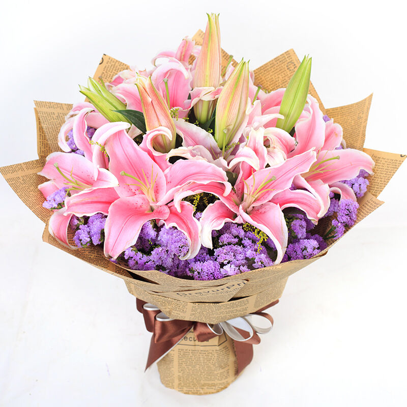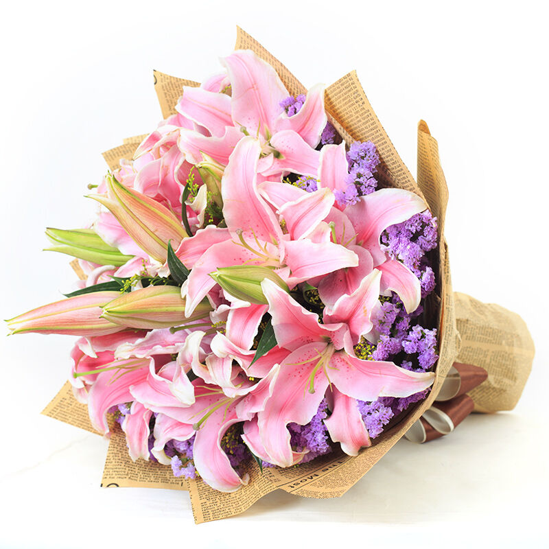 花材: 8枝粉色多头香水百合,搭配勿忘我丰满点缀(若勿忘我断货,则用紫色满天星平替)。