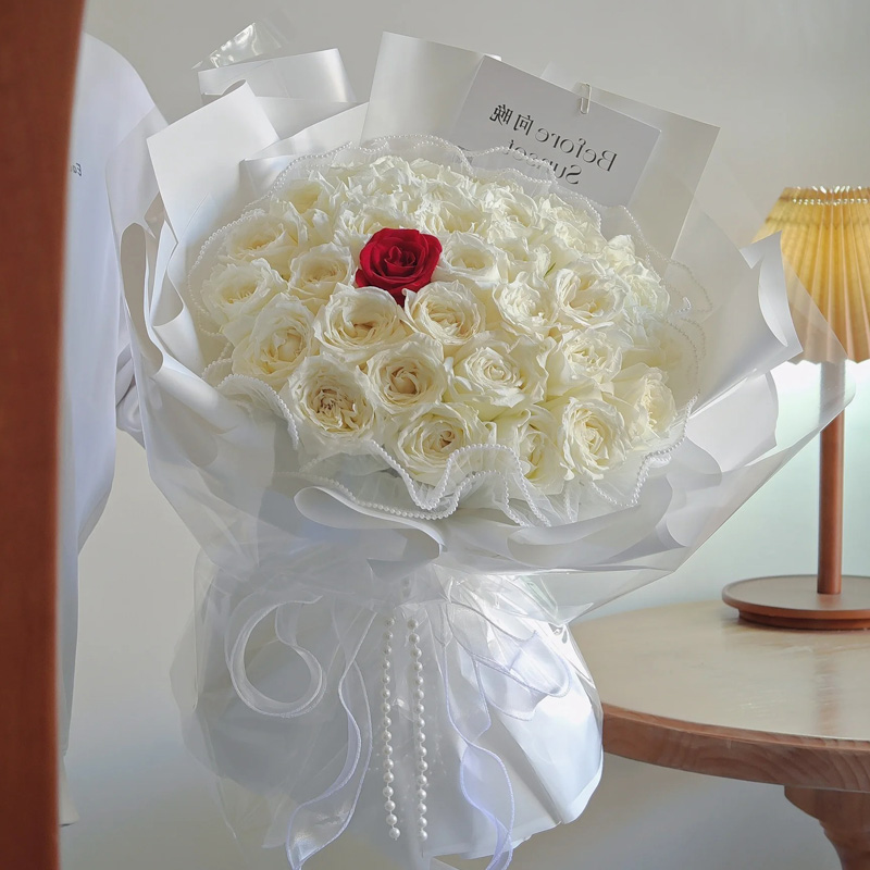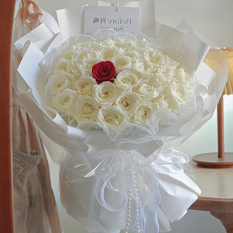 包 装:白色波浪纱内衬,白色亮面纸多层外包,最外层玻璃纸,用白色蕾丝和珍珠链条系大花结。