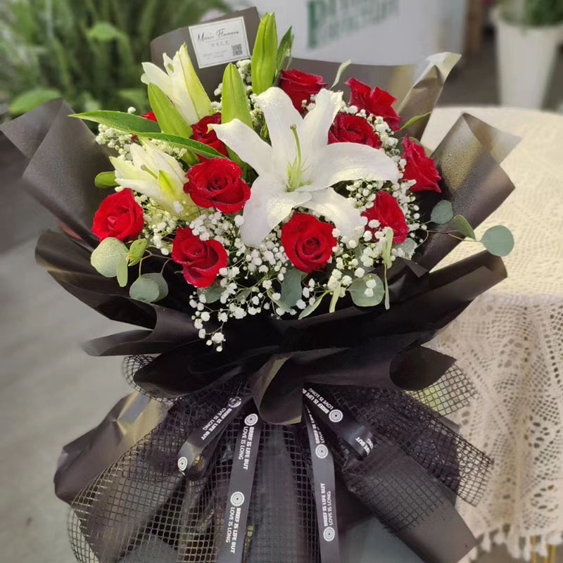 花材: 11朵红玫瑰,2支白色多头香水百合,搭配满天星、尤加利叶间插。